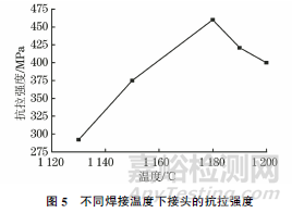 由圖5可見,隨著焊接溫度從1130℃升高到1200℃,接頭的抗拉強(qiáng)度先升高后降低。隨著焊接溫度升高,鈦側(cè)α-Ti等軸晶被晶界處不斷析出的β-Ti占據(jù),部分α-Ti轉(zhuǎn)化為α'-Ti。在長(zhǎng)時(shí)間高溫條件下焊縫晶粒長(zhǎng)大,同時(shí)在壓力作用下晶粒產(chǎn)生畸變,中間層元素與母材元素?cái)U(kuò)散距離增加,黑色脆性相消失。隨著中間層元素在母材溶解擴(kuò)散量增多,以及鈦在相變溫度下與20鋼側(cè)鐵、碳等元素形成TiFe、TiFe2、TiC金屬間化合物和有限固溶體,接頭強(qiáng)度提高。當(dāng)焊接溫度為1180℃時(shí),接頭的抗拉強(qiáng)度最高,為460MPa。隨著焊接溫度繼續(xù)升高,20鋼側(cè)晶粒尺寸增大,導(dǎo)致力學(xué)性能下降。
