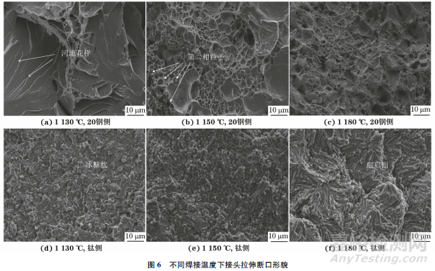 在拉伸試驗(yàn)過(guò)程中,所有接頭均先在鈦側(cè)焊縫處開裂,然后在復(fù)合界面處開裂,最后在覆材處開裂。這是因?yàn)殁亗?cè)的熱膨脹系數(shù)(9.5×10-6K-1)與20鋼的熱膨脹系數(shù)(12.8×10-6K-1)相差較大,焊縫處存在熱應(yīng)力,且在焊接熱循環(huán)下鈦側(cè)發(fā)生α→α'+β轉(zhuǎn)變,使接頭塑性變形抗力增大,強(qiáng)度提高,韌性降低,所以斷裂先發(fā)生在鈦側(cè);鈦側(cè)斷裂時(shí)復(fù)合界面處所受的切向力大于基材與覆材之間的結(jié)合力,因此鈦側(cè)斷裂后復(fù)合界面處發(fā)生開裂。由圖6可見:當(dāng)焊接溫度為1130℃時(shí),20鋼側(cè)接頭斷口形貌為平坦河流花樣,有解理棱,該斷口為脆性斷裂,力學(xué)性能較差;鈦側(cè)斷口類型則為沿晶斷裂,斷口呈光滑小平面冰糖狀花樣,這也是典型的脆性斷裂特征。當(dāng)焊接溫度為1150℃時(shí),20鋼側(cè)斷口中存在部分尺寸均勻的第二相粒子,韌窩大小不一;鈦側(cè)晶粒尺寸長(zhǎng)大,組織不均勻,第二相粒子及黑色脆性相處易產(chǎn)生應(yīng)力集中,導(dǎo)致裂紋萌生,從而降低接頭力學(xué)性能。當(dāng)焊接溫度為1180℃時(shí),20鋼側(cè)斷口中未觀察到第二相粒子,韌窩尺寸不均勻;鈦側(cè)斷口中有明顯的解理臺(tái)階和拉伸作用下形成的波紋狀扇形面,解理臺(tái)階為典型脆性斷裂特征;此溫度下接頭拉伸斷口為典型的脆韌混合斷裂形貌特征。