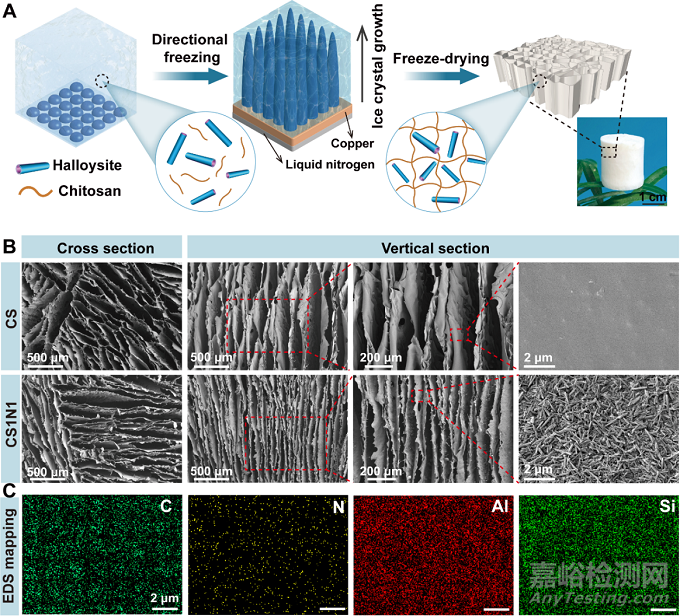 殼聚糖/膠原/埃洛石復(fù)合海綿是通過溶液共混-冷凍干燥法制備,制備流程圖如圖1A所示。將埃洛石和殼聚糖混合液置于模具中進(jìn)行定向冷凍,液氮作為冷源,提供自下而上的溫度梯度來定向冷凍懸浮液。冰晶沿著冰凍方向生長,埃洛石和殼聚糖被擠到冰晶之間的界面以實(shí)現(xiàn)固液分離。最后通過冷凍干燥,冰晶通過升華變?yōu)闅怏w,留下軸向高度取向的多孔結(jié)構(gòu)(圖1B)。SEM圖也可以看出,埃洛石均勻分布在殼聚糖中。圖1C中,HNTs特有的Al和Si元素均勻分布也說明了這一點(diǎn)。