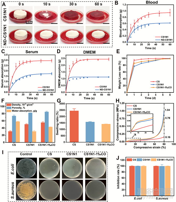 為了比較定向與非定向冷凍干燥海綿吸收液體速率及吸收量,相同體積的海綿分別吸收了全血、血清、細(xì)胞培養(yǎng)基。圖3A可以看出,定向冷凍干燥的海綿在10 s時(shí)已經(jīng)吸收了大部分血液,30 s時(shí)吸收基本完畢。不管吸收何種溶液,定向海綿表現(xiàn)出較大的吸收量和較快的吸收速率。這得益于定向冷凍技術(shù)賦予了海綿軸向有序、規(guī)則的孔隙通道,使海綿具有更高效的液體傳輸速率,這有助于在傷口大量出血時(shí)快速吸血。圖3F比較了CS, CS1N1 and CS1N1-1‰CO的密度、孔隙率和吸水能力,埃洛石的加入提高了殼聚糖海綿的密度和孔隙率??紫堵适侵寡罅系囊豁?xiàng)基本性能,具有高孔隙率的海綿具有較大的表面積,有利于血紅細(xì)胞的黏附和富集。同時(shí),孔隙互聯(lián)能夠提供氧氣和營養(yǎng),為細(xì)胞提供良好的生理環(huán)境,有利于傷口保持在潮濕的環(huán)境中,并促進(jìn)細(xì)胞增殖和傷口愈合。CS1N1-1‰CO敷料具有生物可降解性(圖3E)和抑菌性(圖3I),對金黃色葡萄球菌和大腸桿菌表現(xiàn)出高達(dá)99%的抑菌率(圖3J),有助于減少傷口相關(guān)并發(fā)癥以防止傷口受外部細(xì)菌感染,從而達(dá)到更好的止血和傷口愈合。