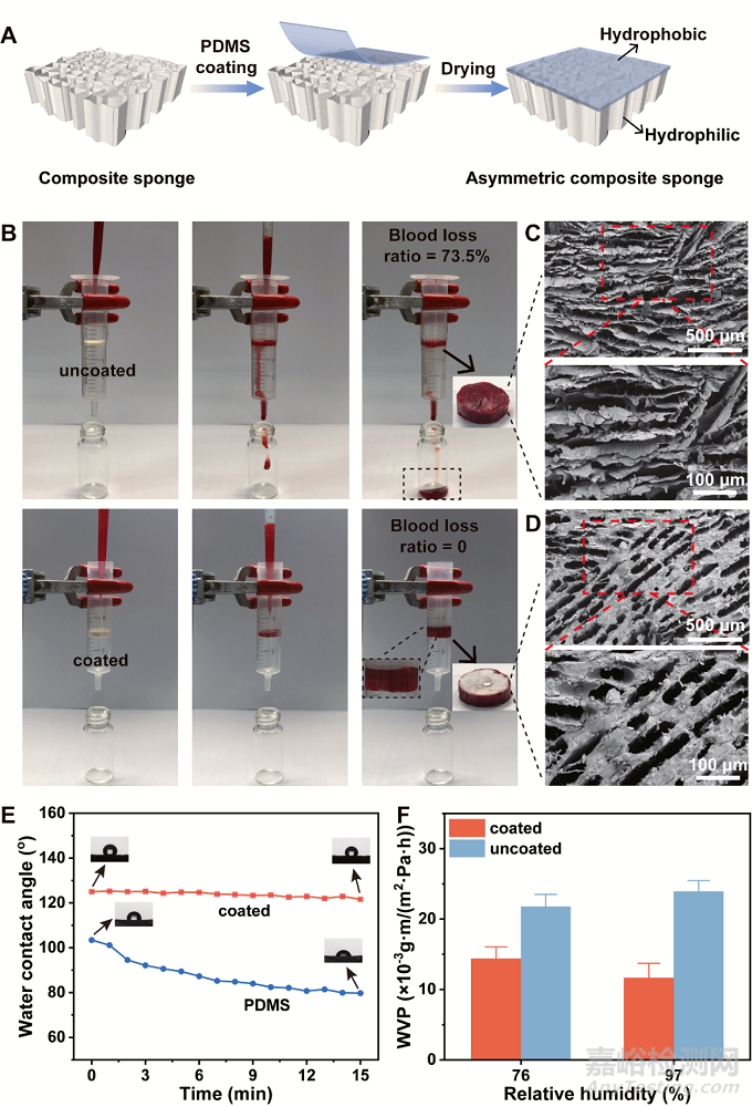圖4A 展示了非對稱性海綿的制備過程,通過在海綿的一面涂布一層PDMS,達(dá)到非對稱性的效果。為了測試PDMS疏水層對血液的阻隔情況,未涂布PDMS的海綿血液流失量達(dá)到73.5%,而非對稱性的海綿在吸血飽和后能在較長的一段時(shí)間內(nèi)兜住血液不讓其往下流。圖4E疏水面水接觸角在15 min內(nèi)僅從122.4o降低到109.4o,也證實(shí)了疏水面的疏水穩(wěn)定性。同時(shí),涂布PDMS的海綿仍保持一些孔隙(圖4D),維持了止血敷料的透氣性。因此,PDMS涂層既能防止血液的反滲透,阻擋外界物質(zhì)通過孔道進(jìn)入傷口,降低傷口受感染的風(fēng)險(xiǎn),還能維持止血敷料的透氣性,創(chuàng)面的空氣流通還可以促進(jìn)凝血因子、血小板、纖維蛋白的聚集從而達(dá)到凝血。