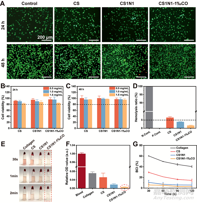 作為與傷口直接接觸的材料,良好的生物安全性和細(xì)胞相容性是必不可少的。采用L929細(xì)胞(小鼠成纖維細(xì)胞)測定細(xì)胞相容性。用AM/PI進(jìn)行熒光染色,如圖5A所示,梭形細(xì)胞均勻分布,如圖5B,在不同濃度的海綿浸提液的培養(yǎng)基共培養(yǎng)24 h和48 h,采用CCK-8檢測試劑盒檢測細(xì)胞活力,各組細(xì)胞活力均超過80%。圖5D中,復(fù)合海綿溶血度均低于5%,具有較好的血液相容性。圖5E凝血行為和圖5G凝血指數(shù)(BCI)表明CS1N1-1‰CO海綿具有較好的凝血性能。