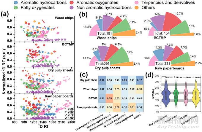 如圖1所示,對于RPBs、BCTMP、DPSs和WCs這四種類型的樣品,經(jīng)HS-SPME-GC×GC-QTOF-MS分析,分別定性出331、154、295和191種VOCs,包括芳香烴類化合物、芳香族含氧化合物、萜類及其衍生物、脂肪族含氧化合物、非芳香烴類化合物和其他共6大類化合物,表明GC×GC-qTOF-MS技術(shù)在復(fù)雜樣品的VOCs表征上比傳統(tǒng)的GC-MS技術(shù)更具優(yōu)勢;另一方面,經(jīng)進(jìn)一步統(tǒng)計(jì)分析,上述化合物在不同樣品中呈現(xiàn)出特異性分布,且檢出頻次存在較大差異,如:BCTMP中定性出比WCs更多的芳香族含氧化合物,表明桉樹木料中的木質(zhì)素在制漿和漂白過程中發(fā)生了解聚;DPSs中的脂肪族含氧化合物分布與RPBs相似,表明前者可能是后者中脂肪族含氧化合物的主要來源;RPBs中出現(xiàn)了較多的烷基苯類化合物(RI=1500~1900),而這些化合物在原材料中均未檢出,表明其可能在后續(xù)的生產(chǎn)過程中引入。