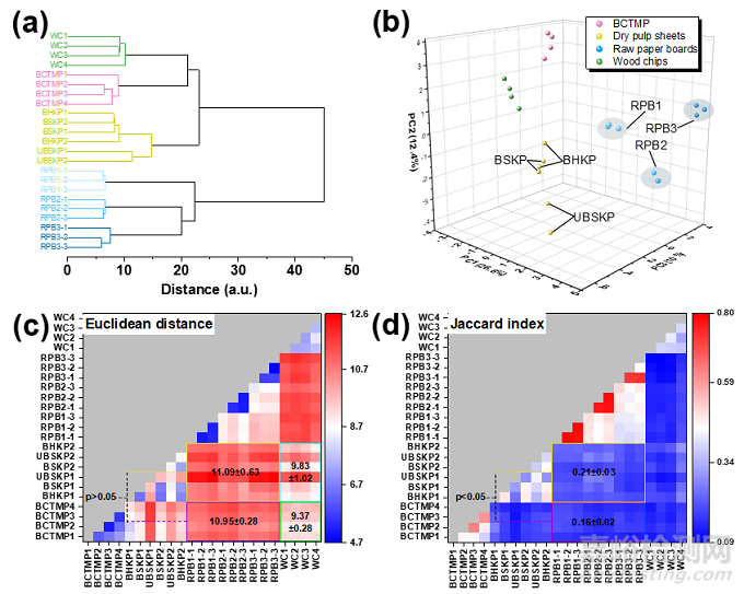進(jìn)一步對食品接觸用原紙板與其原材料中VOCs進(jìn)行相關(guān)性分析。如圖2所示,聚類分析和主成分分析均表明各類樣品中檢出的VOCs具有顯著差異。歐式距離分析表明,WCs與BCTMP和WCs與DPSs的VOCs相似性具有顯著差異,這表明DPSs與BCTMP或采用了不同的制漿工藝。此外,Jaccard指數(shù)分析表明,DPSs與RPBs比BCTMP與RPBs具有更高的VOCs相似性,表明DPSs或?qū)PBs中的VOCs貢獻(xiàn)更大。