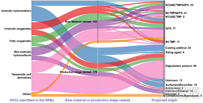 在RPBs中檢出的331個(gè)VOCs中,153個(gè)VOCs在BCTMP、DPSs或WCs中檢出,表明這些VOCs可追溯至原材料;而其余178個(gè)VOCs僅在RPBs中檢出,表明這些VOCs很可能在后續(xù)生產(chǎn)流程中產(chǎn)生,其來源包括但不限于涂布添加劑、施膠劑、大分子降解產(chǎn)物、表面活性劑、抗氧化劑、消泡劑、殺菌劑、環(huán)境污染物等。