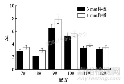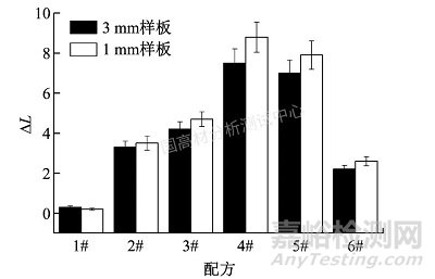 由圖2可以看出: 針對 3 mm 樣板,1 #配方彎折后的 ΔL 為 0. 3,2#配方彎折后的 ΔL 為 3. 3,說明均聚 PP 的耐彎折發(fā)白性能更優(yōu),這是因為均聚 PP 樹脂的結(jié)晶度高,材料內(nèi)部的缺陷少,而共聚PP 中乙烯的存在使得材料內(nèi)部本身存在一定的缺 陷,在受到外力作用時,這種缺陷更容易發(fā)展為微裂紋或者銀紋等,從而更容易產(chǎn)生應(yīng)力發(fā)白的現(xiàn)象。加入填充物及增韌劑后,材料的彎折發(fā)白現(xiàn)象變得更加明顯,ΔL 最高為7. 5。填充物滑石粉本身為淺灰色或者白色,加入后會改變材料內(nèi)部的結(jié)構(gòu),PP 分子不能完全包裹滑石粉,材料受到彎折時,滑石粉外漏,從而顯現(xiàn)出白色 ; 增韌劑 POE 的加入可以提高材料的韌性,但是少量的POE的引入相當于在樹脂體系中加入了雜質(zhì),反而阻礙了PP 的結(jié)晶,導(dǎo)致體系內(nèi)晶區(qū)減少,微孔或者裂紋增加,加劇了應(yīng)力發(fā)白的情況。共聚 PP3 的加入使得樣品的 ΔL 降低,這是因為共聚 PP3 為無規(guī)共聚 PP 材料,是完全不結(jié)晶的材料,本身具有非常優(yōu)異的透明性,這種 PP 產(chǎn)品合成時乙烯插入到丙烯分子鏈中,不會形成乙烯相,所以本身內(nèi)部不會產(chǎn)生微孔,在一定程度上可以降低應(yīng)力發(fā)白的情況, 但是改善效果不是很明顯 。6#配方提高了色粉含 量,ΔL 降低為 2.2,發(fā)白現(xiàn)象大大減輕,這是因為黑 色母含量的提升掩蓋了由于彎折產(chǎn)生的發(fā)白現(xiàn)象, 從而降低了彎折前后的色差變化。