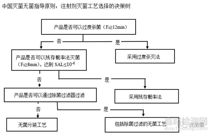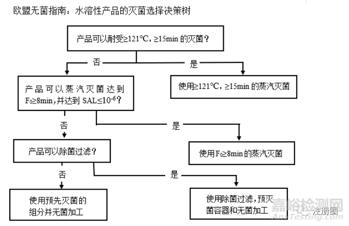 歐盟推出的《制劑、原料藥、輔料和內(nèi)包材滅菌指南》,以水溶性產(chǎn)品的滅菌決策樹終端滅菌工藝為例,歐盟的理念是盡可能地提高生產(chǎn)工藝的無(wú)菌保證水平,用以保證產(chǎn)品的無(wú)菌保證值。