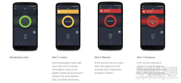 邁心諾醫(yī)療所開發(fā)的Masimo Opioid Halo使用先進(jìn)的模式識(shí)別算法來實(shí)時(shí)檢測(cè)和量化阿片類藥物引起的呼吸抑制的風(fēng)險(xiǎn)。它與分布式架構(gòu)相結(jié)合,可以發(fā)送警報(bào)給患者及其家人、朋友和護(hù)理人員。當(dāng)Opioid Halo認(rèn)定患者已經(jīng)服用過量阿片類藥物且可能需要幫助時(shí),將自動(dòng)觸發(fā)可能導(dǎo)致派遣EMS(Emergency Medical Services,緊急醫(yī)療服務(wù))的自動(dòng)健康呼叫。