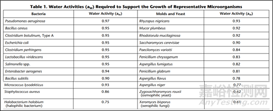 革蘭陰性菌,如銅綠假單胞菌、大腸埃希菌和沙門氏菌在aw<0.91 的產品中不會增殖,革蘭陽性菌,如金黃色葡萄球菌在aw<0.86時不會增殖,黑曲霉在aw<0.77 時不會增殖。