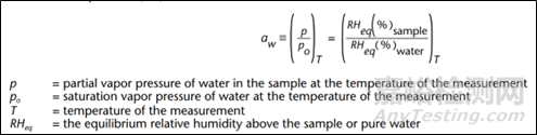 水活度(aw),是相同溫度下產品水蒸氣壓(P)與純水蒸氣壓(Po)的比值。