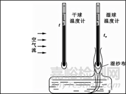 用濕紗布包扎普通溫度計的感溫部分,紗布下端浸在水中,以維持感溫部位空氣濕度達到飽和,在紗布周圍保持一定的空氣流通,使周圍空氣接近達到等焓。示數(shù)達到穩(wěn)定后,此時溫度計顯示的讀數(shù)近似認為濕球溫度。以下是USP中此方法的計算公式。