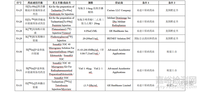 氟[18F]美他酚注射液、氟[18F]脫氧葡糖注射液、氟[18F]代雌二醇注射液、氟[18F]比他班注射液、6-[18F]氟-L-多巴注射液、氟[18F]脫氧葡糖注射液、氟[18F]化鈉注射液、氟[18F]妥西吡注射液、氟[18F]妥西吡注射液、氟[18F]洛貝平注射液、氟[18F]洛貝平注射液、锝[Tc-99m]奧昔膦酸鹽注射液制備試劑盒、锝[Tc-99m]奧昔膦酸鹽注射液制備試劑盒、锝[99mTc]替曲膦注射液、锝[99mTc]硫化膠體注射液、锝[99mTc]噴替酸鹽注射液、锝[99mTc]亞甲基二膦酸鹽注射液、锝[99mTc]甲氧異腈注射液、高锝[99mTc]酸鈉注射液、尿素[13C]呼氣試驗(yàn)診斷試劑盒、尿素[13C]片呼氣試驗(yàn)藥盒、尿素[14C]膠囊、鎵[68Ga]伊索曲肽注射液、鎵[68Ga]伊索曲肽注射液制備用藥盒、鎵[68Ga]多特安肽注射液、碘[123I]芐胍注射液 |