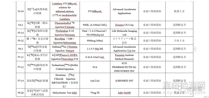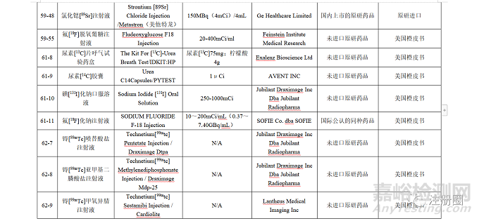 氯化鍶[89Sr]注射液、硼[10B]法侖注射液、碘[131I]化鈉口服溶液、镥[177Lu]氧奧曲肽注射液 |