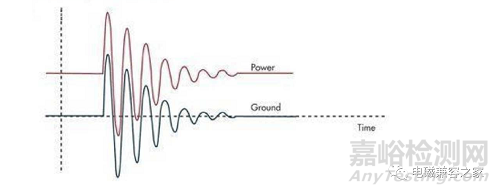 圖3:通過限壓器將大的浪涌電流注入到地將引起PCB地的反彈,并表現(xiàn)為連接電感的一個(gè)函數(shù)