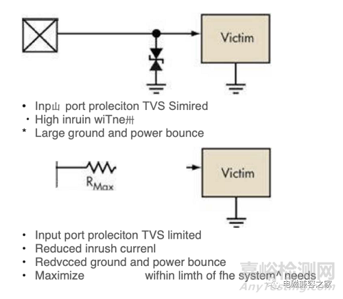 串聯(lián)電阻也有助于地的穩(wěn)定。此外,讓ESD浪涌電流遠(yuǎn)離數(shù)字芯片的I/O單元可以防止芯片內(nèi)部出現(xiàn)地線反彈,從而允許處理器在外部限壓器吸收浪涌電流沖擊時(shí)保持正常工作。