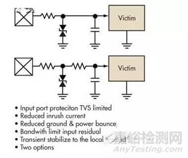 通常帶寬限制本身不會(huì)解決ESD問題。低通濾波器對(duì)小型ESD的衰減也要求60dB至150dB才能消除瞬態(tài)電壓,這對(duì)簡(jiǎn)單的無源濾波器來說是很難做到的。TVS限壓器可以將信號(hào)下拉到電源軌之間。
