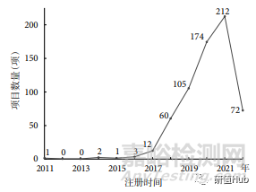 注冊項目數(shù)量 從 2015 年開始,RWS 注冊項目數(shù)量逐年遞增,2021 年達到 212 項,2022 年截至 5 月 4 日注冊數(shù)量達到 72 項。結(jié)果見圖1。