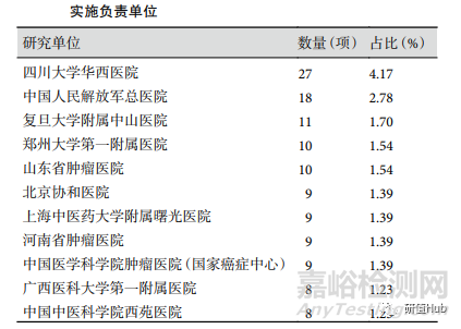 研究實施負責單位和實施地點 所有項目涉及的研究實施負責單位共 269 家,注冊項目數(shù)量最多的 11 家單位見表 1,注冊項目數(shù)量≥5 項的單位共 34 家。199 項注冊項目為兩個及以上醫(yī)院合作, 其中與韓國進行國際合作的項目 2 項,省內(nèi)醫(yī)院合作項目 97 項,跨?。ㄊ校┽t(yī)院合作的項目 99 項。研究實施地點數(shù)量前 3 位的?。ㄊ校┓謩e為北京(65 項)、 江蘇(51 項)和河南(48 項)。實施地點最多的項目為華中科技大學(xué)附屬協(xié)和醫(yī)院作為主辦單位實施負責的一項促動力藥維持治療功能性消化不良的臨床療效與安全性研究,由 98 家醫(yī)院共同合作。