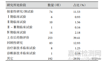 研究所處階段 注冊信息中明確研究所處階段的項目有 450 項(70.09%),最多的為上市后藥物評價 253 項(39.41%),其次為回顧性研究 83 項(12.93%),Ⅱ、Ⅲ期臨床試驗共有 11 項(1.72%)。各階段研究項目數(shù)量見表2。