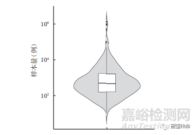 注冊項目樣本量 642 項注冊項目的總樣本量為 7,815,542 例,其中樣本量超過 1 萬例的共 53 項,小于 50 例的共 59 項;除樣本量為 0 的注冊項目外,樣本量最小的為 10 例,最大的為 133 萬 例;所有項目樣本量的中位數(shù)及四分位數(shù)為 482(150,1500)例,樣本量分布見圖2。
