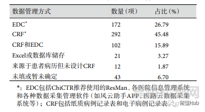 除最低注冊條目外,數(shù)據(jù)管理系統(tǒng)同樣存在內(nèi)容不符合要求的問題。注冊結(jié)果中僅有 102 項(15.89%)同時包含病例記錄表 (case record form, CRF) 和電子數(shù)據(jù)采集與管理系統(tǒng) (electronic data capture,EDC),其余為僅使用 CRF 或 EDC, Excel 或數(shù)據(jù)庫儲存,來源于患者病歷但沒有設(shè)計 CRF,暫未確定或未填。結(jié)果見表6。