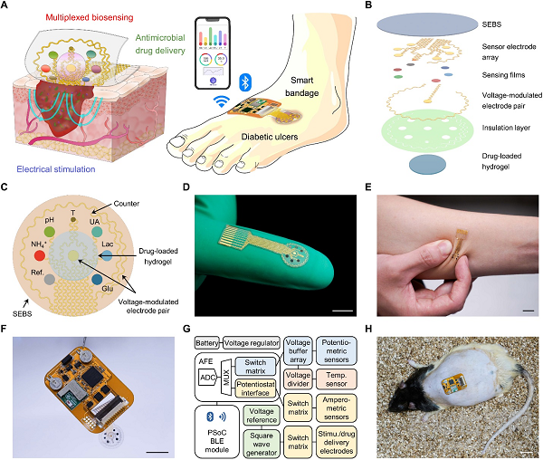 慢性不愈合傷口是全世界主要且增長(zhǎng)迅速的臨床并發(fā)癥之一。慢性傷口愈合是一個(gè)高度復(fù)雜的生物過(guò)程,由四個(gè)相互重疊的階段組成:止血、炎癥、增殖和重塑。目前的療法經(jīng)常需要緊急手術(shù)干預(yù),而濫用和誤用治療藥物往往會(huì)導(dǎo)致耐藥和復(fù)發(fā)。如何精確監(jiān)測(cè)傷口狀況并實(shí)施有效可控的療法是一項(xiàng)臨床重大挑戰(zhàn)。