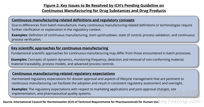 2018年,ICH首次批準(zhǔn)制定關(guān)于連續(xù)化生產(chǎn)的指南,計劃于2021年完成草案并公開征求意見,并于2022年11月發(fā)布。ICH Q13旨在解決幾個主要問題(見圖1):