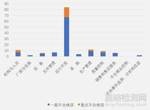 從規(guī)范獨立軟件附錄各章節(jié)不符合項分布情況(見圖一)來看,設計開發(fā)占比最多,不合格品控制無不合格項。占前五位的分別為設計開發(fā)(59%)、生產(chǎn)管理(8%)、機構(gòu)與人員(8%)、質(zhì)量管理(6%)和文件與記錄(5%)。