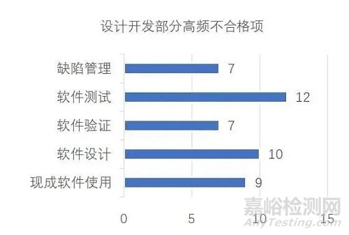 進一步分析設計開發(fā)部分,主要不合格項集中在“軟件測試、設計、現(xiàn)成軟件使用、驗證和缺陷管理”等五個方面(見圖二)。