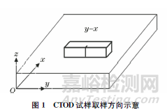 試驗材料板厚為25mm,材料為12Cr1MoV鋼。按照3個測試標(biāo)準(zhǔn)中相互取交集的部分進(jìn)行斷裂韌度CTOD試樣的加工制備、疲勞裂紋的預(yù)制及試驗,CTOD試樣為3點彎曲矩形試樣,取樣方向為y-x方向,x為鋼板的主變形方向,y為橫向,與板寬度方向重合,z為鋼板的最小變形方向,與板厚方向重合。試樣的厚度B、寬度W分別為25mm和50mm,試樣長度為230mm,試驗跨距S為200mm,試樣未開側(cè)槽。CTOD試樣取樣方向如圖1所示。