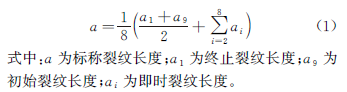 采用微機控制電液伺服疲勞試驗機,在室溫下預(yù)制疲勞裂紋,預(yù)制裂紋長度約為4mm,加載方式為正弦波,應(yīng)力比為0.1。疲勞裂紋預(yù)制完成后,將試樣放入低溫試驗箱,通過液氮制冷方式將試樣溫度降到測試溫度(20,0,-10,-20,-40,-60℃),試樣在低溫下的保溫時間為規(guī)定時長(保溫時間不低于15min),再進(jìn)行3點彎曲試驗。試驗開始后,測試系統(tǒng)自動記錄載荷(F)-缺口張開位移(V)曲線。測試完成后,根據(jù)F-V曲線測定測試過程的峰值載荷Fmax、缺口張開位移塑性分量Vp及缺口張開位移曲線下面積的塑性分量Ap。測試完成后將試樣壓斷,用光學(xué)顯微鏡觀察其斷口,測量裂紋長度,測量精度不低于0.025mm,平均裂紋長度計算公式為