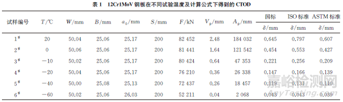 張強、徐誠等研究人員制備了同時滿足以上3個標(biāo)準(zhǔn)要求的測試試樣,按照以上3種標(biāo)準(zhǔn)規(guī)定的測試方法對同種材料在不同溫度下進(jìn)行斷裂韌性測試,再根據(jù)以上3個標(biāo)準(zhǔn)規(guī)定的計算公式進(jìn)行CTOD計算,并對測試結(jié)果進(jìn)行比較分析,判斷其中的差異,為工程實際應(yīng)用提供依據(jù)。