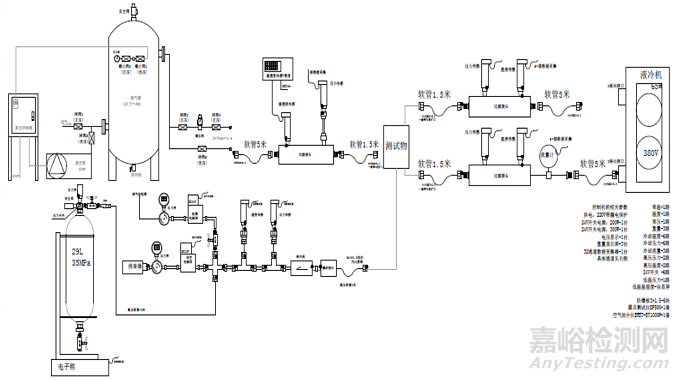 冷卻系統(tǒng)模擬機(jī)載液冷環(huán)境,針對(duì)空氣增壓裝置制氣過(guò)程中頻繁啟停、高壓段制氣功率的變化,對(duì)應(yīng)解決自動(dòng)恒溫恒壓?jiǎn)栴},空氣增壓裝置接入冷卻系統(tǒng)后,控制冷卻液壓力(1±0.02)MPa、流量(5±0.5)L、液冷溫度恒定在25℃,熱交換走空氣增壓裝置約2kw熱耗,結(jié)合“數(shù)據(jù)采集、測(cè)量系統(tǒng)”測(cè)量空氣增壓裝置排氣壓力、過(guò)濾性能、充氣速率、散熱性能、流體阻力、出氣口氣體品質(zhì)等功能性能技術(shù)指標(biāo)檢測(cè)。