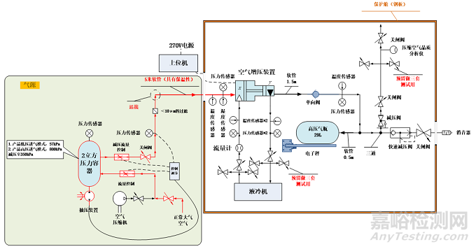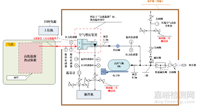 空氣增壓裝置和進(jìn)氣軟管末端分別放入兩個(gè)高低溫試驗(yàn)箱中,將空氣增壓裝置所在試驗(yàn)箱溫度設(shè)定為70℃,進(jìn)氣軟管末端所在試驗(yàn)箱溫度設(shè)定為60℃,空氣增壓裝置在70℃環(huán)境下貯存,貯存時(shí)間為技術(shù)要求時(shí)間或達(dá)到溫度穩(wěn)定時(shí)間,啟動(dòng)空氣增壓裝置,空氣增壓裝置在低溫進(jìn)氣環(huán)境下工作,并測(cè)試空氣增壓裝置相關(guān)性能指標(biāo)(結(jié)合數(shù)據(jù)采集、測(cè)量系統(tǒng)),原理設(shè)計(jì)圖見(jiàn)圖3。
