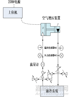 空氣增壓裝置和進(jìn)氣軟管放入高低溫試驗(yàn)箱中,將試驗(yàn)箱溫度設(shè)定為-55℃,空氣增壓裝置在-55℃環(huán)境下貯存,貯存時(shí)間為技術(shù)要求時(shí)間或達(dá)到溫度穩(wěn)定時(shí)間,啟動(dòng)空氣增壓裝置前,啟動(dòng)液冷系統(tǒng)工作10min,空氣增壓裝置在低溫進(jìn)氣環(huán)境下工作,并測(cè)試空氣增壓裝置相關(guān)性能指標(biāo)(結(jié)合數(shù)據(jù)采集、測(cè)量系統(tǒng)),原理設(shè)計(jì)圖見(jiàn)圖3。