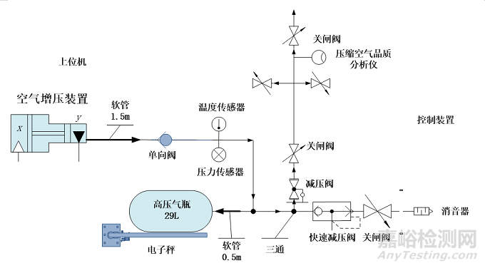 測(cè)量系統(tǒng)中的自動(dòng)化控制:使用傳感器自動(dòng)控制空氣增壓裝置制滿(mǎn)氣體停機(jī),氣體品質(zhì)測(cè)量減壓模塊開(kāi)關(guān)使用遠(yuǎn)控電磁閥通斷,35MPa高壓氣瓶排空,使用遠(yuǎn)控電磁閥通斷控制減壓閥排空氣體。數(shù)據(jù)采集、測(cè)量系統(tǒng)原理設(shè)計(jì)圖見(jiàn)圖5。