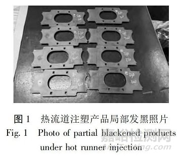 在金發(fā)科技與中山詩蘭姆共同開發(fā)的“藍色無鹵阻燃玻纖增強高溫尼龍材料注塑汽車零部件”項目中,采用熱流道方式注塑,存在產品發(fā)黑異常導致無法正常生產,如圖1所示。
