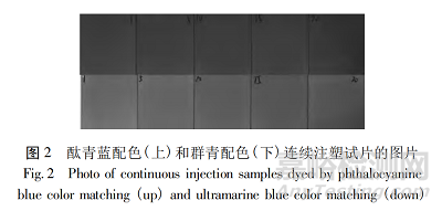 金發(fā)科技采用無機顏料群青替代有機顏料酞青藍,在理論注射容積為153cm3的注塑機進行加嚴熱滯留測試發(fā)現(xiàn):第1模和第20模的色差從原來的10個點降低至約2個點,如圖2所示。
