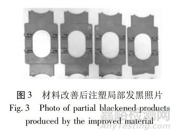 但在客戶端熱流道上注塑依然存在局部發(fā)黑現(xiàn)象,如圖3所示。金發(fā)科技遂與客戶共同針對該無鹵阻燃高溫尼龍材料的成型工藝進行研究,主要包括:機臺噸位,溫度的選擇,注射速度,注射壓力和成型周期等方面。
