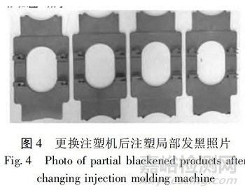 遂更換機臺為東芝230T,其理論容積318cm3,單次注射量/最大射出量≈20%。更換機臺后顏色有所改善,但仍存在發(fā)黑,如圖4所示。