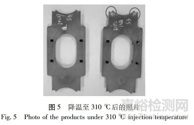 客戶采用8段溫控箱提高至13段溫控箱,更加精準控制,同時將溫度設定于320℃,主要考慮材料熔點為305~310℃,溫度過高容易導致變色加劇。嘗試將溫控箱和注塑溫度降溫至310℃,雖然可以改善發(fā)黑,但產品出現(xiàn)冷膠發(fā)白現(xiàn)象,并且注塑僅1h后出現(xiàn)尾部燒焦,如圖5所示。
