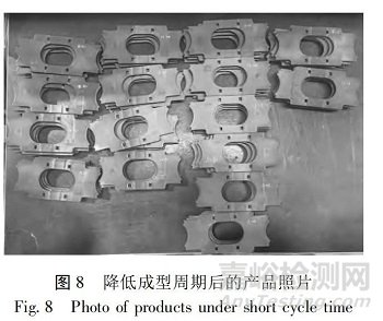通過將模座的速度從原來的15%提升至30%縮短開模和合模時間。經過以上優(yōu)化,成型周期從原來40s下滑至18s,生產效率提高了55%,材料的滯留時間從原來的200s下滑至90s,產品無發(fā)黑及發(fā)白現(xiàn)象,如圖8所示。