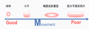 (2)片形大小和形狀會對包衣效果造成一定影響。有些片形并不適合包衣,例如片芯邊角比較尖銳,容易導(dǎo)致包衣片磨損問題;膠囊型的片形或者平面片容易造成粘片“雙胞胎”問題。包衣出現(xiàn)問題最少的片形應(yīng)該是圓的雙凸面片形。如果選擇異形片,則需要厚度適中,片中央弧度適中,邊角處也應(yīng)具有一定的圓度,要保證片子在包衣鍋內(nèi)流暢的自然翻滾,翻滾越好,則成膜越均勻,包衣效率越高,否則片子在鍋內(nèi)翻滾流動性就會較差,甚至?xí)霈F(xiàn)片子貼著鍋壁打滑,影響成膜效率,還會出現(xiàn)片面磨損的問題。另外當(dāng)片芯大小的直徑超過11mm時,片子越大,其與包衣鍋?zhàn)矒舻膭菽茉酱?,產(chǎn)生的磨損力越大,因而包衣膜邊緣破損的幾率就越大。因此要根據(jù)物料的性質(zhì)選擇形狀和大小適宜的壓片模具。