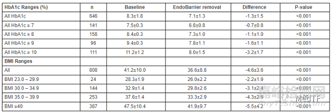 根據(jù)對HbA1c分析顯示 ,基線HbA1c越高,經(jīng)EndoBarrier治療的降低幅度越大。同樣,該研究表明基線 BMI越高,減少的幅度越大。HbA1c 或體重減輕在年齡或性別方面沒有差異。