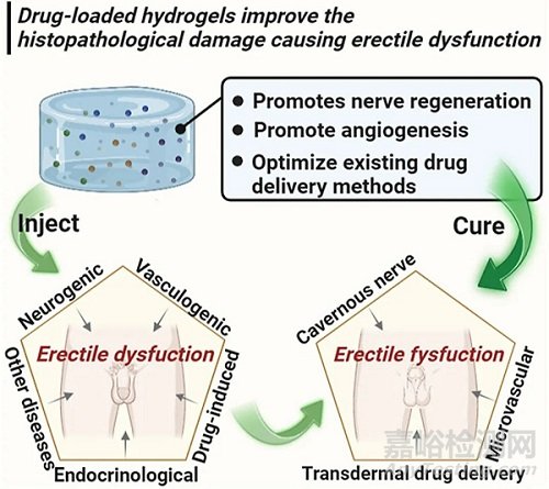 陰莖勃起的本質(zhì)是由多種因素共同調(diào)節(jié)的神經(jīng)血管事件。神經(jīng)和血管損傷是導(dǎo)致勃起功能障礙的主要原因。目前,ED的主要治療方案包括磷酸二酯酶5型抑制劑(PDE5Is)、體內(nèi)注射和真空勃起裝置(VED),然而這些策略的生物利用度低、全身不良反應(yīng)高、患者體驗差、侵入性強和應(yīng)用有限。最重要的是,目前的這些療法很難治愈ED。水凝膠提供了許多優(yōu)于現(xiàn)有療法的優(yōu)勢。它們可以由具有不同性能的各種原料合成,并且具有可調(diào)控的力學(xué)性能。良好的生物相容性和生物降解性也使其成為有效的藥物載體。各種載藥水凝膠可以促進(jìn)神經(jīng)和血管再生,以改善甚至逆轉(zhuǎn)引起ED的組織病理學(xué)損傷。
