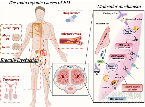 一氧化氮(NO)是該過程中放松平滑?。⊿M)的主要神經(jīng)遞質(zhì),并參與陰莖勃起(圖1)。非腎上腺素能非膽堿能(NANC)神經(jīng)纖維和內(nèi)皮細(xì)胞在性刺激時釋放NO,從而激活鳥苷酸環(huán)化酶并提高環(huán)鳥苷單磷酸(cGMP)的濃度,80%的ED病例是由NO-cGMP系統(tǒng)功能障礙引起的。乙酰膽堿由副交感膽堿能神經(jīng)纖維釋放,激活腺苷酸環(huán)化酶,導(dǎo)致環(huán)磷酸腺苷(cAMP)水平升高。cGMP和cAMP都充當(dāng)細(xì)胞內(nèi)第二信使,激活磷酸化某些蛋白質(zhì)的特異性蛋白激酶,最終降低細(xì)胞內(nèi)Ca2+水平和SM松弛。當(dāng)SM放松時,血液充滿海綿狀空間,對筋膜下小靜脈造成壓力,并阻斷靜脈流出。這樣,隨著動脈血流量的增加和靜脈流出的阻斷,腔內(nèi)靜脈的壓力增加,完成了陰莖從依賴位置到勃起狀態(tài)的轉(zhuǎn)變。相反,當(dāng)cGMP被5型磷酸二酯酶(PDE5)水解為一磷酸鳥苷(GMP)時,上述過程被逆轉(zhuǎn),然后陰莖松弛。因此,這些過程中的任何一種功能障礙都可能導(dǎo)致ED。神經(jīng)源性或血管源性損傷是ED的主要病理機制。