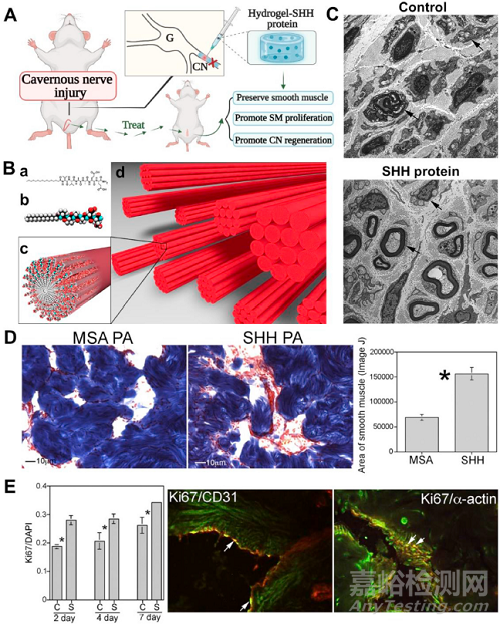 治療海綿體神經(jīng)損傷引起的勃起功能障礙可以通過應(yīng)用水凝膠和SHH蛋白來完成(圖2)。為了有效抑制CN損傷引起的細(xì)胞凋亡,可以使用基于肽兩親性(PA)的納米纖維將SHH蛋白遞送到陰莖海綿體SM,該納米纖維可以自組裝成水凝膠。實驗結(jié)果表明,SHH-PA治療可以有效抑制細(xì)胞凋亡,保存陰莖中的平滑肌,并促進(jìn)其增殖。其他研究也表明,在前列腺切除術(shù)后的再生條件下,SHH-PA治療可以減少膠原蛋白,增強軸突的形成,并使CN再生。