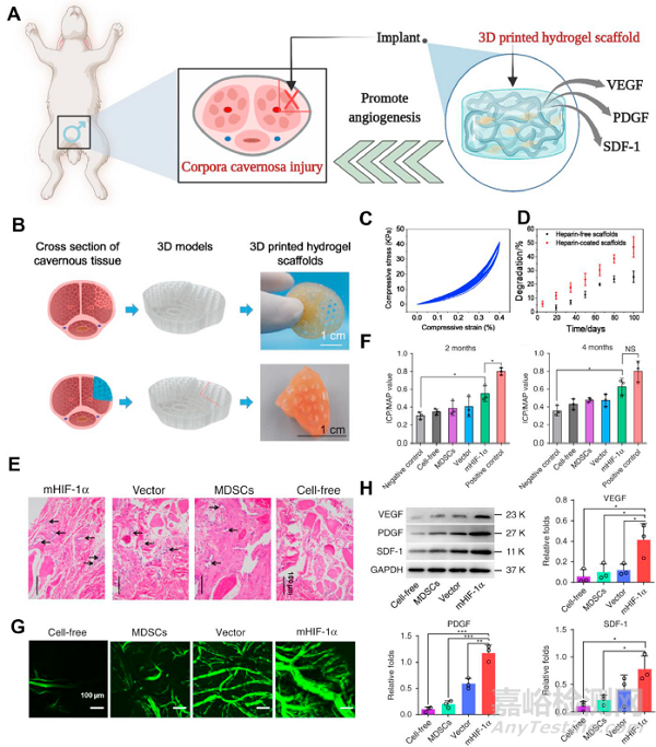 通過構(gòu)建肝素涂層的3D打印水凝膠支架,植入缺氧誘導(dǎo)因子-1α(HIF-1α)突變的肌肉衍生干細(xì)胞(MDSCs),可修復(fù)兔子受損的海綿體(圖3)。植入的3D打印水凝膠支架不會因陰莖中的結(jié)構(gòu)應(yīng)力升高而受損,能經(jīng)受20次壓縮試驗(應(yīng)力高達(dá)40kPa)(圖3C)。水凝膠支架上的肝素可以在支架表面吸附和富集HIF-1α產(chǎn)生的血管生成因子,并刺激體內(nèi)血管生成。新生血管的增加進(jìn)一步促進(jìn)了受傷海綿體勃起功能的恢復(fù)。在體外降解實驗中,含有和不含有肝素的水凝膠支架都表現(xiàn)出很強的生物降解性(圖3D)。這項工作表明,具有血管生成細(xì)胞的3D打印水凝膠在陰莖重建以恢復(fù)男性生殖能力方面具有廣闊前景。