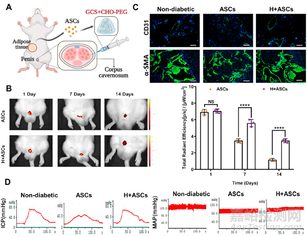 另一種負(fù)載脂肪干細(xì)胞(ACSs)的苯甲醛封端的聚(乙二醇)/乙二醇?xì)ぞ厶牵–HO-PEG/GCS)水凝膠具有可注射性和自我修復(fù)性,可以延長干細(xì)胞在海綿體中的滯留時間(圖4A)。它可以與ASCs協(xié)同降低cGMP水平,并增強ASCs以改善糖尿病纖維化。實驗結(jié)果表明,水凝膠有效延長了ASCs在陰莖海綿體中的保留時間(圖4B),抑制平滑肌細(xì)胞的凋亡(圖4C)。因此,在1型糖尿病ED大鼠中,水凝膠和干細(xì)胞的共同作用實現(xiàn)了勃起功能的恢復(fù)。