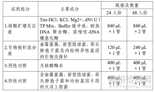 1、曲霉菌屬、新型隱球菌及耶氏肺孢子菌核酸檢測試劑盒的主要組成成分